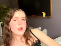 Redhead ladyboy in black lingerie jerks off her small cock